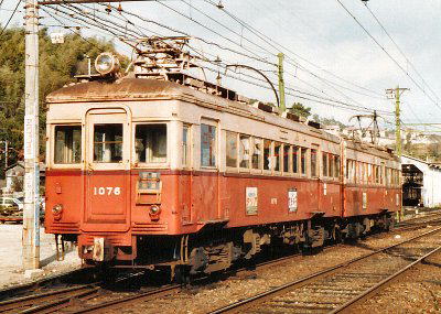 他社からの転入車、及びその改造車が多くを占めていますね。 しかし、広島電鉄のオリジナル車も存在します。 それが、1060形です。 1060形は1957年にナニワ工機(現 アルナ車両)で製造された宮島線用の自社発注車両です。 広電初の平行カルダン車で。台車はND-102。長電の2000形と同タイプです。 当時としては意欲的な高性能車で電空併用ブレーキも採用しました。 しかし1060形は1両しか作られませんでした。 1980年代、他の宮島線専用車は2連固定に改造されましたが、 1両しか存在しない1060形は単行のまま運用を続け、 晩年は宮島競艇場への貸し切り電車として主に使われました。 廃車は1989年です。 今回、この1060形をの珍車として取り上げたのは、 1両しかいないという希少価値もさることながら、 なぜ広島電鉄がこのような高性能車を作っておきながら、なぜ量産しなかったのか。 その謎に迫りたかったからです。 さて、先に高床車のラインナップをご紹介したのには理由があります。 それらの画像のドア位置に注目していただきたかったからです。 私は生まれてこの方ずっと阪急沿線に住まいしてきました。 嵐山線で活躍していた210形も記憶していますし、 能勢電には、ほぼオリジナルの状態で500形が移籍していましたので 彼らの姿に見慣れた私にとって、このドア配置は異様の一言でした。 これは、路面電車に多く見られるスタイルです。 なぜ、このような改造をしたのでしょう。 もちろんオリジナルの1060形もこのスタイルです。 鉄道車両の扉、とりわけ通勤用車両にあっては、 短時間に多くの乗客を捌く必要から、大型のドアを車両に均等に割り当てます。 しかし路面電車の場合、少し事情が違います。 ターミナルなどでは駅員さんが料金を収受することもありますが、 いわゆる電停では乗務員さんがこれを受け取るのです。 ですから、乗り口と降り口を分け、 料金ゲートとなる乗降口では一人ずつ通れるくらいの幅が都合がいいのです。 また路面電車といえば、そのほとんどがワンマンカーですが、この場合 運転台のすぐそばにドアを持ってゆくことになります。 かくして車両の中央部に大きな入り口、車端部に小さな出口 というスタイルができあがってゆくのです。 加えて、路面電車の電停は相対式と相場は決まっています。 日本の道路は左側通行ですから、 運転手さんは進行方向の左側で料金を収受することになり、右側を使うことはありません。 ならば使わない扉は取っ払って座席をセットする方が乗客にとっては有り難い。 というわけで、非対称のドア配置ができあがりました。 そこで宮島線です。もちろん全線専用軌道の路線なのですが、 併走する国鉄山陽線とは違い、駅の間隔は狭く、国鉄時代、 西広島−宮島間におけるその駅数は、山陽線の4 に対し 宮島線はなんと21です。 ちなみに宮島線の駅はそのほとんどが無人駅でかつホームはすべて相対式です。 旅客扱い上は、プラットホーム付きの電停と考えて差し支えないでしょう。 宮島線はその全長16.1km。市内線の全長 18.8kmと比較して思いの外、長いという印象はありますが、 その乗客は宮島に向かって一方的に減ってゆくばかりで効率のよい路線とはいえません。 車両数も1983年当時、総在籍数169両のうち、直通車は49両。 鉄道線専用車に至っては 16両にしか過ぎません。 つまり、広電にあってはあくまで、市内線こそが本体であって、宮島線は付属路線と考えるべきなのです。 乗客にしてみても、市内線の流儀でそのまま宮島線を利用できる方が気楽です。 よって宮島線の車両は路面電車仕様でよい。ということになってゆくのです。 ただ1060形がデビューした当時はというと、 高床車のメリットが捨てきれない情勢でした。 実は、1060形が登場した一年前、市内線用に広電は550形を登場させているのですが、 そのうちの551号は、当時はやりのPCCカーを意識した高性能車でした。 しかし、その状態はあまり芳しくなく、車庫で昼寝をしていることが多かったのです。 メンテナンスでも、キャパシティーでも、高速性能についても高床車がまだ優位に立っていたということです。 でも、スピードでは、前述したように山陽線には所詮勝てないのです。 鉄道線専用車は2000形(直通車)に牽引されて千田車庫に入場したらしいのですが、 1060形は単独で自走できたそうです。 ひょっとしたら、1060形を直通運転させることも考えていたのかもしれません。 鉄道線車両が、併用軌道に乗り入れてくる例は、今もなお福井鉄道で見られます。 福井鉄道には電停があり停車時に出てくる大きなステップで昇降します。 電停自体の数が少なく停車時間も長く設定されるため大きな問題にはなりませんでした。 しかし、この風景はバリアフリーの時代にはそぐわないものです。 福井鉄道でも、まもなくこの姿は見られなくなります。 まして広電の市内線で同じような光景はというとちょっと想像できませんね…。 やはり、路面電車仕様の電車が直通