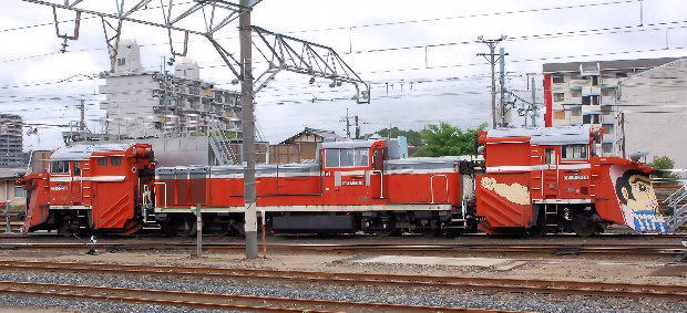 しかしDD15 はラッセル装置を装着すると軸重が 15.5 t に達し、 規格の低い線区では使用できませんでした。 またラッセル装置の脱着にはクレーンを要することから 冬季は除雪専用となり、 一般車として兼用することが困難という弱点を持っていました。 そこでこれらの弱点を克服すべく ラッセル装置を台車つきの前頭車とした DE15形が開発されることとなったのです。 DE15はDE10をベースに開発されました。 DE10はローカル線用として、また入換にも使用できる万能機関車です。 エンジンは本線用ディーゼル機関車DD51形に搭載されたDML61系 (1,200PS級V型12気筒)で、これを1基搭載しました。 エンジンや変速機をDD51と同系統とすることで、 保守性の向上を図っています。 軸重を軽減しながらも牽引性能を維持するため 動軸を5軸としたのが最大の特色です。 前後非対称の車体、3軸+2軸(AAA+B)の台車配置などユニークな構造を持ちながらも 入換作業はもとより、貨物列車や客車列車の牽引までをこなす高い汎用性を持ちます。 DE15はそんなDE10の性能はそのままに除雪用の機能を付加したものといっていいでしょう。 DE15は当初、0・1000・1500番台が新製車で登場していますが、それらの番台区分はDE10のそれに準じています。 すなわち基本番台(SG搭載)に加え、 出力を向上したDML61ZB形 (1350PS / 1550rpm)エンジン を搭載したグループが 1000番台(SG搭載)1500番台(SG非搭載)です。 (なお500番台(SG非搭載)はDE15には存在しません。) DE15は、当初、複線用のラッセルヘッド装着車しか製造されませんでした。 0・1000・1500番台とも、すべて複線用ラッセル車です。 しかしその後、単線用も要望されるようになり、単線用のラッセルヘッド装着車も登場します。 その際、新造された2500番代と単線用のラッセルヘッド装着車に改造された7両が追加されることになるのです。 これら7両は改番されて登場しています。 単線用の番代区分は2000番代ですが、 改造車は種車(1000、1500番台)の千位を2として、さらに改造車はこれに50をプラスする事となりました。 2050番台は2両・2550番台は5両が誕生しました。 内訳は2052・2053・2555・2556・2558・2563・2567の7両です。 当然のことながら2000番台の登場は新たに台車付き複線用ラッセルヘッドを併せて増備することとなります。 画像をご覧ください。 DD15のそれとは違って、立派なものですね。運転室がついています。 ナンバープレートまで付いています。 前述したように、DD15の場合ラッセル装置を機関車の前後に装備することで、 折り返し地点での方向転換作業を不要としたことが大きなメリットとなっていました。 ところが当初、DE15ではラッセルヘッド車は1台しか装備されませんでした。 つまり単頭形です。 向きを変える場合はラッセルヘッド車を油圧ジャッキで持ち上げ180度回転させて降ろすということで方向転換をしました。 そうなれば、もちろん機回しは必要です。不便ですね。 案の定というか。1976年すなわち10年後からはラッセルヘッド車を2つ装備し、両頭車として登場しました。 そして単頭車だったものは両頭車改造されました。 この過程は複雑です。 単純にラッセルヘッド車を1つ追加しただけのパターンもあるにはあるのですが、 1510ではこれを取り外して、1511に取り付け、1510自体にはラッセルヘッド車を2つ新製して取り付けました。 1002ではこれを取り外して、1006に取り付け、1002自体は新たに単線用ラッセルヘッド車を2つ新製して取り付け2052に改番しました。 (後、山形新幹線用のDD18形にラッセルヘッド車を供出したものも5両あります。) 単線用ラッセルヘッド車が当初導入されず、1977年すなわち10年後になって登場したというのも妙な話です。 そうそう、そもそも、なぜ単線用と複線用のDE15が存在するのでしょう? ラッセルヘッド車を取り替えることでどちらの用途にも使えるではありませんか? でもそれでは、単線用の新 キ100形 や複線用の新 キ550形を追加で新造することに他なりません。 ラッセルヘッド車はあくまでパーツでなければならなかったのです。 ここでDE15が登場した1967~81年は国鉄にとってどんな時代だったのか見てゆきましょう。 1965年、国鉄は初の赤字を計上し、68年には赤字83線について意見書が出され、80年には国鉄再建法が公布されました。 そう、その当時、国鉄の財政に対しては周囲の厳しい目が光っていたのです。 1963年~製の115系でさえ、会計検査院からいたずらに形式を増やすな。と苦言が呈されたそうです。 そんな中で所定の目的を達成しようとすれば、ラッセルヘッド車はあくまでパーツとして扱い、 それも単頭車として登場させるしかなかったのではと思われます。 国鉄において財政が危ういとなれば、それは何とかしなければなりません。 しかし、国鉄は営利企業ではないのです。 国民の足を守り支えるという矜恃によって成り立っている存在です。 これはフカヨミに過ぎるといわれればそれまでですが、 DE15の開発に携わったスタッフは、両頭式が良いとい