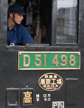 D51形蒸気機関車は1936年(昭和11年)から太平洋戦争中にかけて大量生産され、その総数は1,115両を数えます。 この数字は、日本の機関車1形式の両数としてはディーゼル機関車や電気機関車などを含めても最大となるもので、 日本全国、津々浦々で活躍したD51形は「デゴイチ」の愛称とともに、日本の蒸気機関車の代名詞的存在です。 今回取り上げる498号機は、そんなD51形のなかでも標準的な車両です。 おおよそ珍車として取り上げるには不適当だと思われる向きがあるかもしれません。 しかし、D51形は金太郎飴ではありません。よく見てゆくと1台1台に個性があります。 その個性についてお話しする前に、まずD51形について、かくも大量に量産された理由から述べてゆきたいと思います。 設計の基本となったのは、同じ軸配置(1D1=ミカド)のテンダー式機関車であるD50形です。 しかし、こいつは大型で入線できる路線が限られていました。 そこでD51形に求められたのは、まず軽量化ということになります。 リベットで接合していたものを電気溶接で置き換え、軸重を軽減しました。 スポーク式ではなくボックス式の動輪を採用したことも軽量化に貢献しました。 これらの工夫で最大動軸重は14.3 tに引き下げられ、これによりD50形では入線が困難だった丙線への入線が可能となったのです。 また全長をD50形より571 mm短縮したことで、亜幹線クラス以下の路線に多数存在した60フィート転車台での転向を可能としました。 このことから全国に配備することが可能となったのです。 一方で、ボイラー使用圧力は当初D50形の13 kg/cm2に対して14 kg/cm2と1 kg/cm2昇圧、牽引力をUPしています。 折しも、国内情勢は戦時体制へ突入、 貨物機であるD51形に対する需要は非常に大きく量産に拍車がかかったのはなったのは当然の流れでした。 国内の車両メーカー5社と鉄道省の工場(のうち8工場)が製造に参加しました。 D51 498号機は、昭和15年(1940)11月に鉄道省鷹取工場で製造されました。(製造番号No26) 日本国有鉄道じゃあないですよ。鉄道省です。 戦後世代である我々が知っている国鉄とは、 日本国有鉄道法に基づき戦後(1949年6月)に発足した独立採算制の公共事業体で、 戦前、政府官庁によって経営されていた国有鉄道事業を引き継いだものです。 日本の鉄道は1872年の新橋 - 横浜間~始まるわけですが、 そのときの所轄官庁は工部省鉄道寮というものでした。 その後はというと改組に次ぐ改組で混乱を極めました。 国鉄の基礎ができあがってゆくのは、なんといっても鉄道の国有化です。 これをきっかけに政府は1908年鉄道院を新設し内閣の直属機関としました。 初代総裁は後藤新平。 鉄道省は、1920年にこの内閣鉄道院を昇格させたものです。 このことにより、その独立性を高めました。 鉄道省鉄道局は、鉄道院鉄道管理局を継承、 札幌・仙台・東京・名古屋・神戸(1928年5月、大阪鉄道局に改称し大阪に移転)、門司の6局体制でスタートしました。 1943年11月に戦時体制に伴う統廃合の一環として逓信省と合併し、運輸通信省に改組されるまで、 国電は省線電車とも呼ばれ国民に親しまれてきました。 そう、D51 498号機は、戦前の国鉄の有り様を伝えてくれる証人でもあるのです。 ![]() ちなみに鉄道省の工場で製造されたD51形は228両、D51形全体から見るとその2割ほどになります。 梅小路に保存されているD51形200号機も鉄道省浜松工場で製造されたものです。 今回、私がこの498号機にこだわっているのは、生まれだけではありません。その後の変化です。 200号機が、オリジナルに近い形で保存されているのに対して、 498号機はその後の装備をも含めて動態保存されているのです。 、 D51形が個性的に変身してゆくのは、戦後のことです。 日本全国に活躍の場を拡げたD51形でしたが、 中央西線や伯備線といった山岳路線はD51形の独壇場であったと言っていいでしょう。 しかしこれらの山岳路線はきつい勾配を伴った長大トンネルも多く、 D51形にとっても乗務員にとってもきわめて過酷な環境の連続でもあったのです。 時には60℃を超える運転台で投炭を続ける乗務員に容赦なく襲いかかる煤煙。 実際に煙による窒息事故も多発していたそうです。 その対策として多くのD51形に取り付けられたのが、集煙装置や重油併燃装置です。 集煙装置は機関車の煙突付近に設けられた箱状の装置です。 通常は解放されているこの天窓をトンネル内では閉め切り、 煙突からの排気をトンネル上壁に当てず、装置の後部にある排気口から、排出するものです。 これによって煤煙を機関車の運転台上部から後方に誘導するわけです。 ですから、トンネル内では天窓のシャッターを叩く煙突からの排気が大太鼓のように鳴り響いていたそうです。 重油併燃装置は、蒸気機関車の主燃料である石炭のほか重油を使用するというものです。 起源は明治時代に遡りますが、実用化されたのは戦後復興に伴い石炭不足に見まわれた1951年のことです。 経済的効果もさることながら