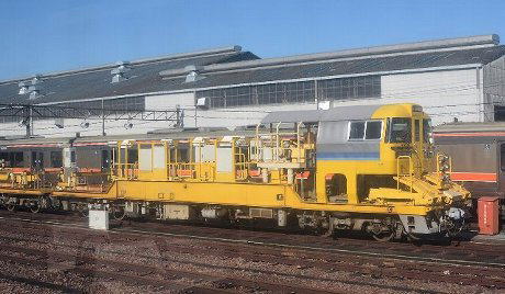 ー 「異形のマスク−−そのわけは−」 JR東海 キヤ97系R101編成キヤ97系は在来線用のレール運搬車両として2007年に製作されました。国内初の気動車によるレール運搬車両で、 定尺レール(25m)運搬用となるR1〜4編成と、ロングレール(200m)運搬用のR101編成があります。 かつては機関車がレール運搬用貨車を牽引する形でレール輸送を行っていましたが、 JR東海ではこれを気動車でやることにしたのです。 なぜ気動車なのか? ということについてはすでに珍車ギャラリー「キヤ97系0番台」でご紹介しているのでこちらをご覧いただくことにして 珍車ギャラリー:キヤ97系 レール運搬車 今回は、ロングレール運搬車として特化したR101編成について、つっこんだお話をしたいと思います。 そのまえに「レール」について、お話しさせていただきます。 レールとは車両の車輪を支え、列車を一定方向に円滑に走らせるために作られた細長い鋼材 と言うことになりましょうか。 でもそんな単純なものではありません。 1本のレールの長さは、25 mに造られるのが標準です。これを「定尺」(ていしゃく)と呼びます。 またこれを200m以上に溶接したものをロングレールといいます。、 (なお25mより短いものは短尺(たんしゃく)といいます。 30kgレールはおおむね20m=短尺、また25m超え200mに達しないものは長尺と呼ばれます。) ロングレールは継ぎ目が少ないので、それだけ振動や騒音が減り、乗り心地もよくなるほか、保線作業が軽減されるメリットがあります。 そこで、定尺レールを現地で溶接するのですが、より効率よく作業を進めるために工場(レールセンター)で200mのロングレールにし、 それを現地で溶接、一般的には1〜2キロの長さにするというやり方で、ロングレール化は着々と進められています。 (世界最長ともなると東北新幹線の沼宮内−八戸間の60.4キロのロングレールというのもあります。) ですが、長くするには場所的・技術的制約があります。 まず、駅構内のポイント付近や急カーブの箇所などには導入が難しくなります。 ですから曲線半径600m以上という条件がつきます。 またレールは鉄です。暑いときには伸び、寒いときには縮みます。 ちなみにレールの温度が10度のとき、25mだったものは40度になると9mm近く伸びるそうです。 60キロだったら…、24mちかく???。新幹線車両1両分でこりゃあ大変だ! とはいえ、レールは枕木に固定されているので、実際はその計算値よりずっと少ない数字になります。 まあ、そのためには、レールには40Nレール以上を利用使用しなければなりませんし、 強固な道床が必須です。 スラブ軌道ならともかく、バラスト軌道の場合は 「砕石バラスト使用し道床の肩幅400mm以上、PCまくらぎを38本/25m以上、…(線路等級により差があります)」 などと取り決められています。 加えてレールは電気回路ということをこの際知っていただきたいと思います。 実はレールにも電気が流れています。 電車は架線から電気を取り込んで、モーターを回したりしますが、 その後は車輪を伝わってレールに流れ、変電所に戻る。これで電気回路は完成するのです。 それなら、うっかりレールに触ったりしたら感電するのでは?。などと思われるかもしれません。 もっとも、その心配はご無用です。 たとえば電線に鳥が停まっても感電しませんね。 それは、電極の片側だけ触ったとしても体に電流は流れないからです。 ただし人間の場合、プラスである架線のほうは危険です。 人が架線の他に体を接触させてしまうとそこがアースになって電流が伝わってしまうからです。 ただしレールはマイナス側だし電圧も低いから大丈夫です。 それと、レールと人間を比べると電気の通しやすさが違います。 確かに人間の体の一部がレールに触れると、地面などに触れている別の部分がアースとなってしまい電流が流れることになります。 しかし電流は電気を通しやすい方に流れていく性質があります。 レールは鉄でできています。電流は人間より流れやすいレールの方へ流れてゆくのです。 というと、レールはどうだっていいように思われそうですが、回路というものはきっちり接続されていないと働きません。 電気鉄道のレールにはそのつなぎ目に短い電線が接続しているのですが断線していたら終わりです。 加えて高周波になると思わぬものにも電気は流れてしまい その誘導電流が思わぬいたずらを起こしてしまうことがあるのです。 もし、それが信号回路であればただ事ではありません。 電車、電気機関車の場合は電気回路の一部となり 非電化区間においても、信号システムの一翼を担うレールの最大の弱点。それはつなぎ目です。 ロングレールを採用すれば、当然つなぎ目は減ります。メリットは乗り心地だけではないのです。 短い定尺レールでも現地で溶接すればロングレールになってゆきます。 しかし、レールの溶接は簡単なモノではありません。ロングレール化のための溶接には、高度な施工技量が必要です。 