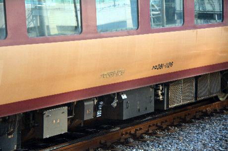 JR西日本では同じ電車でも、その性能が変更されたら、それに応じて番台区分を変えています。 たとえば223系は新快速用として130km/h対応の足回りとなっていましたが、120km/h対応の221系と共通運用になる場合、 混結して使用するので130km/h対応の性能は必要ありません。 そこでこれを6000番台とし、塗装もちょっと変更して見分けがつくようにしました。 再び130km/h対応にする場合には、6000番台の6を取っ払ってしまえばいいわけです。(正確には2000番台に戻ることになります) というわけでクロ381-1と-1000では性能が違うのです。 何が違うかというと、それは振り子装置の傾斜角度です。 381系及び振り子装置についてご存じという方は以下の段落を読み飛ばしていただいて結構です。 381系は国鉄が1973年に自然振り子方式を実用化した特急用電車です。 曲線が多くスピードアップが難しい山岳路線を走る特急「しなの」「やくも」用に投入されました。 振り子装置といっても車内に振り子がぶら下がっているわけではありません。 高速でカーブにつっこむバイクなどを見ていたらよくわかりますが、ドライバーは車体を大きく内側に傾けバランスをとります。 このように車体を左右に振り込んで高速化しようというのが振り子技術です。 鉄道の軌道ではカーブの外側を高くするカントという処置がなされています。 しかしカーブで停車することを考慮して内側に倒れてしまうほどのカントを付けることは出来ません。 バイクと同じように、走行する速度に合わせて車体を傾ける必要があるのです。 ではどのようにして車体を傾けるかですが、強制振り子方式と自然振り子方式の二方式があります。 自然振り子方式とは、曲線にはいると当然発生する遠心力を利用して車体を傾ける方式です。 シンプルで誤動作することがない点が長所ですが、遠心力がかかってから動作するため、振り遅れが生じます。 曲線を抜け出してもしばらく車体は傾むいたままです。 駅構内のポイントでも小刻みな遠心力の発生によりまた無用の揺れが生じます。 そんなわけで気持ち悪いのです。乗ったらわかります。 −−そこで−−− 傾斜角を5°から3°に変更し曲線通過速度と上手に折り合いをつけてゆくことで、一定の効果を得ようというのが381形1000番台です。 さて福知山線に381系が登場したのは2011年3月のことです。 ダイヤ改正時、福知山区に配属された287系の新製予定両数は46両。 86両いた183系の置換えを少しでも進めることから、 紀勢線「くろしお系統」への287系投入により余剰となる381系を転属させて古い183系を淘汰しました。 この時、モノクラスのFH60編成が6連×3本配属されました。 転属に際して国鉄特急色に塗り替えられましたので、見た目古くさくはありましたが、アコモ改善工事済みの381系です。 振り子装置は停止されたため、381形本来の使われ方はされていませんが、 残された183系よりは高性能です。 以後、287系の投入が完了した5月末で定期運用から離脱し、車両は日根野車区に返却の上廃車となりました。 わずか2ヶ月ほどのピンチヒッターでした。 モノクラスでなければ、そのまま福知山に配属されたかもしれませんね。 福知山線に381系が再登場したのは2012年6月のことです。 183系に残された運用を置換える形で投入されました。FE66編成4+2=6連です。 これまた2012年3月に「くろしお」で運用されていた381系の置き換え用として287系が日根野区に投入されたことによって 余剰となった381系を転入したものです。 今度はクロを含む T`sc-M`-M-(-M`-M)-Tc編成です。 今度は本気です。 その後も少しずつ増備され2013年の春にはFE61〜64+41編成に加え増結用2連のFE611〜661で40両を数えるに至りました。 すでに46両配備されている287系とあわせて、183系は完全に置換えられました。 なお、この時も振り子装置は作動させずに走行させています。 さて、2014年6月頃より振り子制御調整の傾斜角を変更する改造が行われました。 性能の変更を伴うことから改番が行われ、各編成とも元番号に+1000を加え1000番台化されたということは前述しました。 これにより振り子制御が使用可能となったわけですが、時刻表を見ても特にスピードアップしているわけでもありません。 本領を発揮するのは、いつのダイヤ改正以後となるのでしょうか。 この春(2015年3月)に北陸新幹線が金沢まで開業しました。 このことで681・683系には余剰車が発生します。 ということで、いずれ、この681・683系が381系を置き換えることになるでしょう。 伯備線でも381系が活躍していますが、比較的新しい後期の車両を集中的に配置しており、 また「ゆったりやくも」として車内にも手を入れていますので、こちらの置き換えは後になると考えられます。 結局、北陸の681・683系がどこに行くのかというと、日根野区と福知山区ということになるでしょう。 さてそんな福知山区に振子角の調整を行い改番までした1000番台を投入しました。 伯備線の381系と同じくらいあるいはその後に作