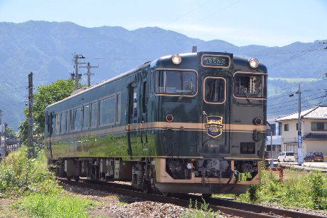 「ちょうど良いくらいの小旅行。」-JR西日本キハ40形 べるもんた「ベル・モンターニュ・エ・メール」べるもんた(正式名称ベル・モンターニュ・エ・メール)は北陸新幹線と接続する新高岡駅を起点に 城端線・氷見線を走る観光列車です。 2015年10月より運行を開始しました。 見ての通り新車ではありません。 キハ40形(キハ40 2027)を金沢総合車両所において改造工事を行なった車両です。 車体塗色はダークグリーンとなり、 車体腰部・窓枠部分・前面下部のスカートにはメタリックゴールドがあしらわれています。 また、貫通扉と側面腰部には、ロゴマークが描かれぐっと高級感がでました。 車内には、沿線の伝統工芸品である「井波彫刻」が施された欄間や、 「高岡銅器」をイメージした吊り革などが目を引きます。 キハ40形の改造車とは思えない雰囲気です! そのなかでも注目すべきは、拡大された固定窓。 それはあたかも額縁のようです。 そう、「べるもんた」は車窓の景色を絵画として楽しむ 「走るギャラリー」がコンセプトとなっているのです。 氷見線で富山湾を至近距離で眺めることのできる車体の側窓は、 そのまま城端線では立山連峰を望むことができます。 そうです。この車窓から「美しい山々と海」を望めることから、 フランス語の”Belles montagnes et mer”=「美しい山と海」を列車名としたのです。 さすがに長くて覚えにくいので、愛称名を「べるもんた」としていますが、 この名前の由来だけは押さえておきたいところです。 というわけで、特等席は、海側を望む座席となるでしょう。 窓沿いにしつらえられたテーブルにむけて配置されたカウンター席です。 反対側の山側には、中央部に2人掛けのクロスシートと 折り畳み式のテーブルを備えた4人掛けのボックスシートが並んでいます。 負け惜しみかもしれませんが、こちらから見た方が額縁越しになるので、 「走るギャラリー」を実感できます。 というわけでおわかりですね。私、「べるもんた」に乗ってきました。 ちなみに、私が指定券を入手したのは前日の夜、大船駅のみどりの窓口です。 キャンセル待ちでようやく空いた一席をゲットしました。 おもしろいことに「べるもんた」の車端部にはロングシートが配置されています。 最後の一席とはいえ、私にあてがわれた席はロングシートではありません。 「べるもんた」は全席指定席ですが、このロングシートは、 飛び込みの乗客も受け入れる余地があると言うことなのでしょう。 ちなみに、おしゃれなつり革まで設置されています。 それにしても、ロングシートにクロスシート。 加えて窓際には本物の飲食店のカウンターをおもわせる座席がずらり。 1台にこれほどのシートバリエーションを盛り込んだ車両は他には見られません。 「べるもんた」の楽しみは景色だけではありません。車内サービスです。 こちらの写真は「ぷち富山湾鮨セット」。*撮影 Dr K ![]() なんと「べるもんた」の車内で寿司職人が握ってくれたものです。 寿司のネタが並んだ冷蔵ケースまであります。 かつてのビュフェ 「サハシ153」を思い出しました。 しっかりした料理を提供するのに「キシ」ではないのが残念です。 また「べるもんた」沿線の造り酒屋で醸された地酒の「飲み比べセット」もあります。 富山県は冷涼な気候と良質な水そして高品質の酒米を産する酒どころでもあるのです。 ほろ酔い気分で車窓に目をやると、沿線の方々が集まって列車に手を振ってくれています。 暗い車内の奥の方から手を振っても気づいてはもらえないかな。 と思いながらも、手を振りました。 人々とのふれあいと言うほどのものでもないかもしれません。 でも、無条件に心地良い思い出です。 乗客である私にとっては、もちろん初めて…そう一期一会なのです。 ![]() そんな光景を気づかせてくれたのが、マイク片手にガイドをされていた地元の女性でした。 運行日には毎回(二往復すなわち4回)、やって下さっているのだそうです。 皆さん、よく続くなあと思いました。 「べるもんた」は1両編成です。JR西日本の観光列車としてはコンパクトで、 定員はたった39名です。これだけのおもてなしをするのだから、 もう一両増結して、もっと定員を増やしても良いのになあと思っていた時のことです。 先ほどのガイドさんが、民謡を歌ってくださいました。 富山県民謡の「こきりこ節」です。 「こきりこ節」は、富山県の五箇山地方に伝わる古謡です。 意味こそ わかりませんでしたが、歌詞さえあれば…私でも歌える全国的にも有名な民謡です。 「こきりこ」とは放下師といわれる大道芸人が使用した竹の楽器で、 竹2本を指で回し打ち鳴らすものだそうです。 「こきりこの竹は七寸五分じゃ 長いは袖のかなかいじゃ」という歌詞は、 「七寸五分(約23cm)以上長いと かなかい(引っ掛かるの意)=邪魔になる。」 と、ものには適当な長さというものがあるのだと言うことを伝えています。 そうか。思えば、1両編成だから
