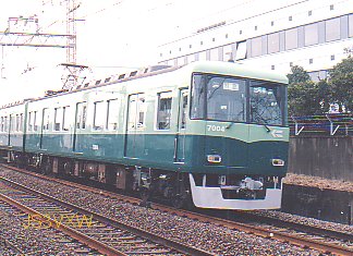 登場したというのをご存じでしょうか。 軌道法で出発した京阪は、1983年まで なんと600V(=路面電車級)だったのです。 それでいて7両編成の冷房車が、 複々線の本線をがんがん走っていたのですから、 それはほんとにすごいことだったというべきでしょう。 さて,昇圧から5年後、1988年に増備された6次車は 当然1500V車ですが、 京都よりの4両ユニットをVVVF制御にしたのです。 左の写真がそれですが、 同じ箱形の出っ張りを3つ連ねた床下の機器を ご確認いただけるでしょうか。 ![]() 旧6014(関目駅) ![]() ![]() 新6014(左)と6064(右) (枚方公園駅) 前後で顔が違います。 ![]() ![]() 7004(左)と7054(右) (鳥羽街道駅付近) これも前後で顔が違います。 一方7000系は、鴨東線開通に伴う新車として1989年デビューしました。 6014での実績を元に当初よりVVVF制御が搭載されていますが、 1993年に登場した第4編成では、 6014の試作ユニットをふくむ3両を7000番台に改番し京都寄りに編入してしまいました。 VVVF制御は7000系、界磁位相制御は6000系とすっきりさせたわけです。 同じく1993年、穴埋めのため新6014ほか3両が新製されます。 わざわざ旧型の6000系のデザインにするわけもなく7000系のを引き継いでいます。 そんなわけで6000系の顔をした7000系と、 7000系の顔をした6000系が存在するということになってしまったのです。