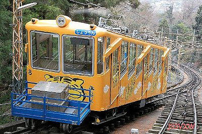 「なーんだ。普通のケーブルカーではないか。」 と思われるかもしれません。 でも、よーくご覧ください。前になんかくっついてます。 気付かれましたか? この存在感のなさ! これこそが今回ご紹介する「コニ7形」です。 こんなのでも(失礼!)ちゃんと車籍があります。 同じ色に塗られてしまっていてよくわかりませんが、正面右下に小さいですが立派なプレートがあります。 、ケーブルとはいえ鉄道です。人のみならず貨物輸送したって何もおかしくありません。 しかし、車籍を有するケーブル線用貨車はこのコニ7形をおいて他には無いようなのです。 さて、黒部アルペンルートには、立山駅から美女平まで鋼索線があります。 立山開発鉄道(現在は立山黒部貫光)が1954年に観光用に敷設したものですが、 ここでは山上道路へ観光バスを運ぶ必要から山下側に貨車を連結しました。 コニ7形とは比べものにならないくらい大型の車両で、小振りながらも立派な乗務員室まで付いています。 しかしながら、私鉄車両編成表1983年版においても2011年版においても、その存在は示されているのですが、車両形式は示されておらず。 車両数総括表(83年版)には、その数にも含められていません。 また、近鉄にあっても、生駒鋼索線 宝山寺1号線のコ2形(2000年廃止)については、 コニ7形と同じく荷重1tの1軸貨車が存在していたようで、西信貴鋼索線と同じく山上側に連結されていたようです。 しかしこれについても、編成表83年度版で、その存在を確認することはできません。総括表においても同様です。 (ただし、コニ7形はちゃんとカウントとされているのですよ!。) 西信貴鋼索線は、信貴山電鉄により昭和5年12月、鉄道線の高安山 - 信貴山門間(山上線:営業キロ=2.1km)とともに開業しました。 信貴山口 - 高安山間の営業キロは1.319km(勾配長)、高低差354m 勾配は169-480‰と近鉄の鋼索線では最も急峻な路線です。 ここで、ポイントとなるのは、鋼索線の終点である高安山は、目的地ではないということです。 高安山駅は信貴山門駅へとむかう山上線への乗り換えポイントに過ぎず、乗客は目的地である信貴山朝護孫子寺へむかうのです。 山上線は、大戦中の1944年、不要不急の路線として廃止されたまま復旧されませんでしたが、 鋼索線は1957年に復旧、山上線は近鉄バスがその代役を果たし、信貴山朝護孫子寺へ参詣客を運びます。 そんなわけで、高安山で降りた乗客は、今もほぼ間違いなくバスに乗車します。 高安山には、展望台があるわけではありません。それどころか駅周辺には売店ひとつ無いのです。 よって、水道が引かれていません。 しかし、山上で働くケーブル運転手や乗務員さんのために、また、乗り換え客のトイレ用に水は必要不可欠です。 そう、この水を運んできたのがコニ7形だったのです。 再度、画像をご覧ください。 正面に信貴山のゆるキャラ「しぎとらくん」が描かれているのですが、コニ7形が邪魔になっていてチョット気の毒ですね。 ご心配なく、コニ7形は2両在籍しますが、通常1両しか使いません。 乗務員の方にお聞きしたら、おおむね1年ごとに取り替えているのだそうです。 山上の高安山駅には、現在、赤いコニ7が静かにその出番を待っています。 その時がきたら、ウィンチでつり上げられ軌道上に設置されコ7と連結される予定です。 それにしても、なぜこのように車両を取り替えるのでしょうか。 うかつにも聞き漏らしてしまいました。