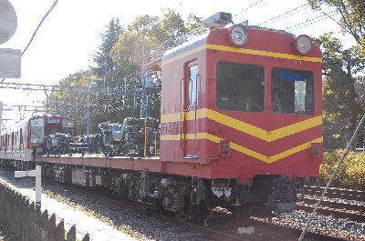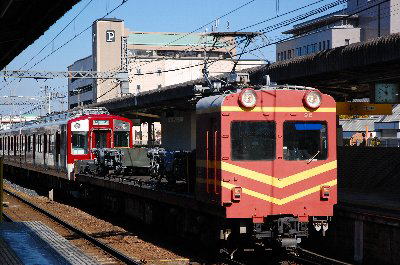 1982年という年は、五位堂検修車庫が新設された年ですが、近鉄において、これは特別な年といえます。 それまで大阪線は高安で、奈良線は玉川で、南大阪線は古市の3工場で車両の整備・検査等の検修を実施していました。 しかし、この年から新設されたばかりの五位堂検修車庫で一括して検修を実施する体制へ移行することとなったのです。 もっとも、高安も古市も検車区として残っています。奈良線にしても玉川工場はなくなりましたが、東花園検車区が健在です。 日々の状態や機能検査はここで行います。 しかし、鉄道車両は定期的に大がかりな手入れをしてやらなければなりません。 近鉄では、新造ののち4年後に重要部検査、そのまた4年後に全般検査というサイクルを繰り返して、 40年後廃車するというライフサイクルを企図しています。 これら重要部検査、全般検査を行う部門を検修部門と呼び、その現場を検修車庫と呼ぶわけですが、 それを五位堂でまとめてやってしまうということです。 (ちなみに、青山峠を越えられない名古屋線車両と三重県の独立路線は塩浜検修車庫で集約します。) これらの検修作業は、車体をつり上げ、台車と分離、 ほかブレーキ、モーター、制御器等も分割してそれぞれのエキスパートが徹底した検査加修を行います。 これらの作業を集約することで設備投資を抑え、適正な人員配置をすることで作業の効率化を図ろうというわけです。 とはいえ、大阪線、奈良線は標準軌、対して、南大阪線は狭軌です。そのまま移動することはかないません。 ですから古市検車区から五位堂検修車庫まで南大阪線用車両を回送するにあたって、 狭軌と標準軌の接続点である橿原神宮前から五位堂検修車庫まで、それらの車両の装着する狭軌用台車を外し、 標準軌用の仮台車を装着することにしました。 当然仮台車にはモーターはありませんから、電動貨車を1両ずつ回送車両編成の前後に連結して運転することにしたのです。 そこでモト90形97・98が南大阪線用車両の回送用電動貨車に指名されました。 モト90形97・98は、1960年大阪線の保線用車両として新製されました。 なお1970年3月に改番されるまでは、モト2721・2722と呼ばれておりました。 全金属製のスマートな車体ですが、 初代1420形(元モニ2230形)が付随車化される際に余剰となった足回りを再生した吊りかけ駆動の旧性能電車でした。 新製当時から2両1組で使用され、レール運搬などに従事してきましたが、 1982年、そんな彼らに新たな使命が与えられたというわけです。 荷台にはレールが敷設されました。台車を積載する時に使用します。 あわせて台車をD-22から2250系の廃車発生品であるKD-15Bへれ交換しました。 それだけではありません。 ブレーキも南大阪線用車両と互換性のあるHSC電磁直通ブレーキに換装しました。 本来ならば、走行できない車両を電動貨車で牽引して工場に持ち込むという方法は、いいアイデアだったようです。 近鉄は、その後、1992年に高性能化された養老線(狭軌)用車両を塩浜検修車庫まで回送するためモト90形94.96を改造。、 そして、第3軌条の東大阪線用7000系を五位堂検修車庫に回送するため、 今度は、モト75形77.78(開業当初はモワ11.12)が改造されることになります。 振り返れば、複雑なその歴史的経緯を経て、多彩な運転線区を抱える近鉄ならではの珍車たちと申せましょう。 モト90形97.98はその後、1995年に、名古屋線用の1800系を養老線へ610系として転用する際に発生した足回り、 すなわちKD-60B台車とMB-3110B電動機、加えて奈良線用800系からの廃車発生品であるMMC-LTB20C制御器を流用、 WN駆動の高性能車となりました。 まだまだ使ってやろうという近鉄の思いが伝わってきます。 思えば、それから18年。1960年の新製時からはもう53年以上の歳月が過ぎたわけです。 五位堂から古市まで、大型トレーラーが通行できるような道路ができたなら、話は別ですが、 まだまだ現役で頑張ってくれるのではないでしょうか。 参考文献;鉄道ピクトリアル No727 特集 近畿日本鉄道 2003年1月 私鉄の車両13 近畿日本鉄道U 1986年2月 先日、五位堂で回送列車が仕立て上げられているのを見て、これはと思い。 畝傍御陵前で粘って走行写真をゲットしました。 橿原神宮前では、結構長く留置しているので、ここで目撃された方も多いのではないでしょうか。 踏切から、または側道からもきれいに撮影できます。