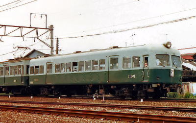 南海電気鉄道では、系列ごとに100の位で車種を判別できるようになっていました。 7000系の場合。Mcは0. Tcは.9 Tは.8 6000系の場合。Mcは0. Tcは.9 Tは.6 という具合です。ですから6901は6000系のTcということになります。 Tcには9をあてがうことが多かったのですが、両端がTcとなる6200系あたりからその原則は崩れ、5がTcにあてがわれています。 さて、今回ご紹介する21201はクハ21201形です。 登場した時期からするとTcですから、21901となるはずです。 でも、どうして21201なのでしょう。 実は、もとは、モハ21201形だったのです。 訳あって電装解除したのですが、改番をせずに形式だけが、クハ21200形に改められたというわけです。 それでは、まずは本来の姿である、モハ21201形についてお話します。 21200系(モハ21201-モハ21203-サハ21801-モハ21202)は、南海本線用11001系(2次車)と同じく、 湘南型と呼ばれる前面2枚窓非貫通型のクロスシート車です。 南海に詳しいお方であれば、塗装こそ違え、これは高野線の21000系と同車体の17m車であることはおわかりいただけるでしょう。 11001系が20m車なのに対し 高野線用の21000系は17m車で、多少寸詰まりなのです。 21201系も同じく17m車です。 しかし21000系と21200系は全く別の系列です。 21000系は、ズームカーと呼ばれることになる新性能車。 対して21200系は、1956年の事故で車体が焼失した1251系の足回りを再利用して 生まれたツリカケ駆動の旧性能電車です。 そんな生い立ちですから、4連が1編成製作されただけです(帝国車両製)。 さて21200系は21001系が登場する前年の1958年にデビューしています。 ついでに言うと南海本線用11001系(2次車)の2年後ということになります。 今更言うまでもなく11000系は南海初の高性能車です。 そのスマートな姿は、南海のイメージを一新し、南海本線に新風を吹き込みました。 高野線でも特急、急行用の高性能車が望まれたのは言うまでもありません。 しかし、高野線は半端な路線ではありません。 山線となる高野下−極楽橋間には50‰という急勾配がある一方で、平坦区間では100km/hですっ飛ばす高速性能が求められるのです。 高野線の規格に合わせて車体長を短くするだけでは話にもならないのです。 ズームレンズのように、使用状況に合わせてその性能を変化させるという技術的障壁を乗り越えなければならなかったのです。 一朝一夕にできるはずもありません。 ですから、3年のタイムラグで、21000系ズームカーが登場したのはすごいことだと思います。 話を元に戻しましょう。 その3年の狭間に登場したのが、この−21200系−ということになります。 事故というきっかけがなければ、登場することはなかったであろうとは思われますが、転換クロスシートの急行仕様車です。 歓迎されたに違いありません。 21000系がデビューして後も、彼らに伍して大活躍しました。 しかし、21000系との性能差は如何ともしがたいものがあります。 モーターの出力は21200形のほうがやや上回るのですが、加速力が違います。 ブレーキは、新型に取り替えられてはいましたが、21000系のHSC-Dの応答性能にかなうはずはありません。 いきおい、遅れがちになる列車ダイヤを取り戻すべく、懸命に全力疾走していたことでしょう。 でも、乗り心地の面から言うと最悪です。(−−−もっとも私は歓迎ですが、) 多段制御の21000系とは比べものになりません。 1967年、21200系は、空気バネ付きのTB-60を新造、釣り合い梁台車であるK-16と取り替えることにしました。 ツリカケ駆動なのに、エアサスとはすごいですね。 でも南海では珍しいことではありません。すでに1521形(旧型車の更新車)などでエアサス台車が導入されています。 ちなみに1521形は特急列車用ではありません。 一般車ではあっても、振動を直に伝えてしまうツリカケ駆動こそ、エアサス台車が望ましい。 という南海の乗り心地に対する姿勢はもっと評価されるべきだと思います。 しかし、同時に座席がロングシートに改められてしまいました。 山線直通急行の混雑ぶりが、平坦区間で際だってきたためです。 21000系も後期形はロングシートですから、仕方がないようにも思えますが、ちょっと残念です。 いや、そうするのなら、もっと残念なのことがあります。 なぜこのとき足回りを21000系に合わせて取り替えなかったのでしょう。 1973年に、南海は架線電圧を1500Vに昇圧しました。 旧型の電装品を多用する21200系は、案の定、昇圧工事の対象から外されてしまうことになるのです。 中間車は解体されましたが、先頭車は、まだ新しいということで解体だけは免れました。 長い前置きになりました。これが、3年後、クハ21200形となるのです。 貴志川線は国鉄和歌山駅から、貴志までを結ぶ14.3kmの支線で、現在は和歌山電鐵の路線となっています。 本線とは直接接続はしておらず、600Vのまま残されていました。 そんなわけで当時、貴志川線は、南海本線の旧型車であった1201形の独壇場となっていました。 1976年。沿線に高校が設置されるこ