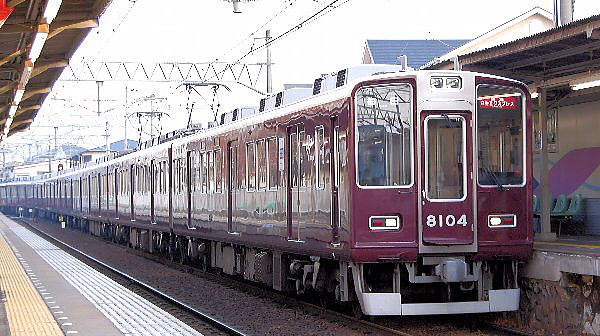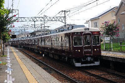 2014年8月。阪急6000系の1編成が能勢電鉄に譲渡されました。 6002F、8両の固定編成です。 2014年現在、能勢電鉄に在籍する車両は、すべて阪急のお古ですが、そのほとんどが4連(一部2連)です。 8連で運行する列車は、平日、朝夕に運転される「日生エクスプレス」しかありません。 つまり、6002Fは「日生エクスプレス」専用ということですね。 4連を2編成、導入するというのなら昼間でも使えるわけですが、6002Fは8連。 昼間は、能勢電ではお仕事がないということになります。 これは一体どうしたことでしょう。 まず特急「日生エクスプレス」とはどんな列車なのか。みてゆきましょう。 「日生エクスプレス」は、阪急 梅田駅 - 能勢電 日生中央駅間を結ぶ、平日のラッシュ時間帯に運転されている直通の特急列車です。 兵庫県川西市・川辺郡猪名川町にまたがる阪急日生ニュータウンに在住する通勤客のために誕生したのです。 (日生はデベロパーである日本生命保険相互会社の略称。) 日生ニュータウンは1970年から造成を開始し、1975年には入居が始まりました。 そして1978年に能勢電鉄日生線(山下−日生中央間)が開通することになります。 特急「日生エクスプレス」が運行を開始したのは1997年11月。 街が成熟するのを受けてスタートしたわけですね。 宝塚線は阪急きっての通勤路線です。 ラッシュ時には8両編成以上の列車がひっきりなしに走っているわけですから、4連では、お話になりません。 能勢電の車両ではまかなえず、阪急の8000系8連が充当され1日6本(上下3本づつ)の運行でスタートすることになりました。 朝のラッシュ時には上り(日生中央駅 → 梅田駅)のみ、 夕のラッシュ時には下り(梅田駅 → 日生中央駅)のみが運行され、それらは基本的に8両編成で運転されるのですが、 それでは足りず、朝の上り7本のうち5本は川西能勢口駅で梅田方に2連を増結し、阪急最大の10両編成となり梅田へ向かいます。 そして、2003年8月には、1日14本(上下7本づつ)に増強されることになりました。 その際、使用車両に追加されたのが6000系です。 直通運転を行う車両は、何でもいいというわけにはゆきません。 乗り入れ先との協定によって車両は限定され、列車の保安設備(ATS・ATC等)や列車無線などの設備も重複して搭載しなければなりません。 直通車両は阪急用の列車無線アンテナのほかに能勢電用の列車無線アンテナも装備しており、これがいい目印になっています。