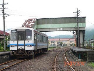 JR西日本は2016年9月30日、三江線(江津〜三次)の事業廃止届出書を国土交通大臣に提出したと発表しました。 廃止予定日は2018年4月1日(日)です。 あと1年とちょっとですね。 以下の記事にあるように、私にとって三江線はJR西日本で唯一、完乗していない路線です。 でもチャレンジはしたのです。 その時感じた、何とかして乗車しなければという思いとともに当線の現実を今一度お伝えしたいと思います。 2006.8..UP 2006.9.13 2006.12.2 2007.6.2 2010/06/13 2017/03/15 追補 *2006年7月19日、山陰地方西部に大雨、三江線は当分の間運休!!J R西日本管内で、私がまだ乗車していない路線は、唯一三江線だけです。100Kmを超える長い路線でありながら、列車本数が少なく、乗車するのが難しいのです。 さてこの夏、意を決して三江線完乗にチャレンジしようとしたのですが、 2006年7月19日、山陰地方西部に大雨が降り、悲しいかな当線は当分の間運休ということになってしまったのです。 旅行を中止しようかとも思ったのですが、三江線の駅近くに見つけた宿もSLやまぐち号の切符も予約してあります。 代行バスツアーもまた、たのしからずや。というわけで予定通り旅に出ることにしました。 7月29日、青春18切符で、新快速−各停と乗り継ぎ、福塩線まわりで三次に着いたのは、16時43分でした。 17時20分の発車まで時間があるので、買い物ついでに少しばかり街中を歩きました。 すると昭和47年の水害時における被災水位のプレートが建物に残されていました。1mをゆうに越える高さです。 往古より江の川は侮れない川なのだなあと実感しました。 江の川と三江線実際、江の川は、私のようなよそ者が想像するレベルを遥かに超えた大河なのです。中国地方の地図を見ると、江の川の終着点である江津市とほぼ南にある広島市との間は、 直線距離にして100kmほどにしか過ぎません。しかし、江の川は島根県と広島県との県境を越え、 幾重にも折り重なるように流れていて、その長さは194kmに及びます。 47年水害のあった三次市は、広島県内にありますが、県北東部の河川は この三次市に流れ込む江の川(可愛川)へ全て集中し、ここから峡谷を縫うようにして、 島根県の県境から江津へと流れてゆくのです。 そしてこの三江線こそは、この江の川沿いに造られた峡谷鉄道なのです。 島根県には、三江線のほか木次線、山口線と陰陽連絡の鉄道路線がありますが、 沿線の地形は全く趣を異にしています。 三江線は、昭和5年4月に石見江津−川戸間が開通してからその歴史が始まりますが、 昭和12年10月に浜原まで開通した後は、ずっと盲腸線のままで、三江北線と呼ばれていました。 一方、三次からは昭和30年3月に三次−式敷間が、そして昭和38年6月に式敷−口羽間が延長されます。 いわゆる三江南線です。 そしてこれらの終着駅、浜原−口羽間が結ばれたのは、昭和50年8月です。 これでめでたく国鉄三江線が全通したのですが、当時、国鉄の赤字はのっぴきならないものになっていて、 その元凶の一つであるローカル線のあり方についても検討されている時代でした。 三江北線も三江南線も昭和43年には不採算路線としていわゆる「赤字83線」にリストアップされており 廃止されてもおかしくない立場にあったのですが、新線により全線開通がなされたことで、 今まで生き延びてこれたわけです。 ジャンボタクシーによる 460列車 三次−浜原間駅に戻ると2台のジャンボタクシーが駐車していました。フロントガラスには代行バスと書かれてはいるものの実際は、代行タクシーです。 三次交通と、芸備タクシーによる460列車は定刻に三次駅を出発しました。 2台で10名ほどの乗車です。タクシーでまかなえてしまうのが悲しいところです。 今回代行タクシーを利用することによって、ローカル線を普段とは全く違った視線から。 つまり車内からではなく、車外から見ることが出来ました。 とりわけ目を奪ったのは、50年開業の新線区間の立派さです。 伊賀和志−宇津井間にある大きな橋梁は2層式で下部には歩道が備え付けられています。(写真左下) そして知る人ぞ知るの宇津井駅は地上20mの高架橋部分に造られた駅で、 116段もの階段を上り下りしなければならない、おおよそバリアフリーという発想からはほど遠い、人に厳しい駅です。 代行タクシーの運転手さんは、ここでの記念写真タイムも「どーぞどーぞ。」と許可してくれました。(写真右下) ![]() 三江線 宇津井駅代行タクシーは、丁寧にひとつひとつ駅前に 立ち寄ってゆきます。 運転手さんでさえ道に慣れておられないらしく、 車1台がやっとの事で通れるような細い道を 行きつ戻りつ走ってゆくのです。 たいそう余分に時間がかかったろうなあ。と思いきや、 目的地の潮温泉(潮駅の手前数百bの所にある)に 臨時停車?をして頂いた時には、 ほとんど遅れはありませんでした。 ![]() 翌朝、浜原駅に来てみると、キハ120が一台、 ぽつんと取り残されていました。今にも動き出しそうでしたが、 レール